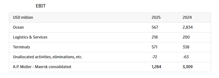 报告期内,马士基实现营收142亿美元,同比下降9.9%;息税前利润(EBIT)约13亿美元,同比下降61.2%。