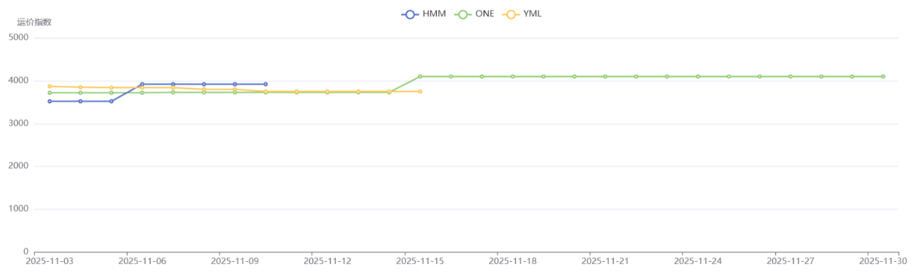 地中海航线,即期市场订舱价格小幅上涨。11月7日,上海港出口至地中海基本港市场运价(海运及海运附加费)为2029美元/TEU,较上期上涨2.3%。