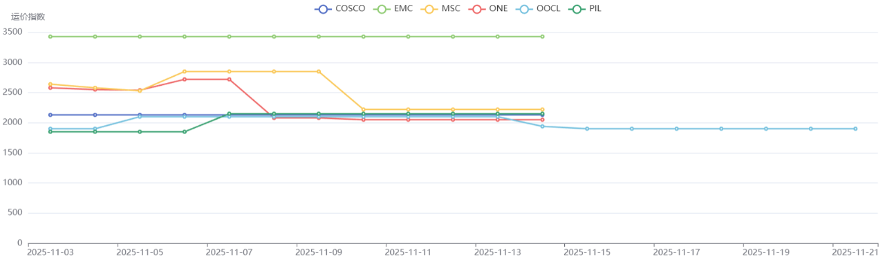 南美航线,运输需求缺乏进一步增长的动力,市场运价继续下跌。11月7日,上海港出口至南美基本港市场运价(海运及海运附加费)为2171美元/TEU,较上期下跌15.4%。