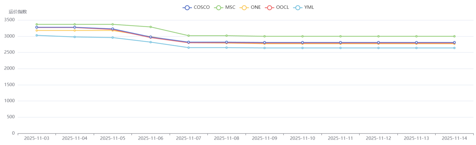 11月7日,上海航运交易所发布的上海出口集装箱综合运价指数为1495.10点,较上期下跌3.6%。四大航线中,除地中海航线小幅上涨外,欧线、美西、美东都迎来下跌。